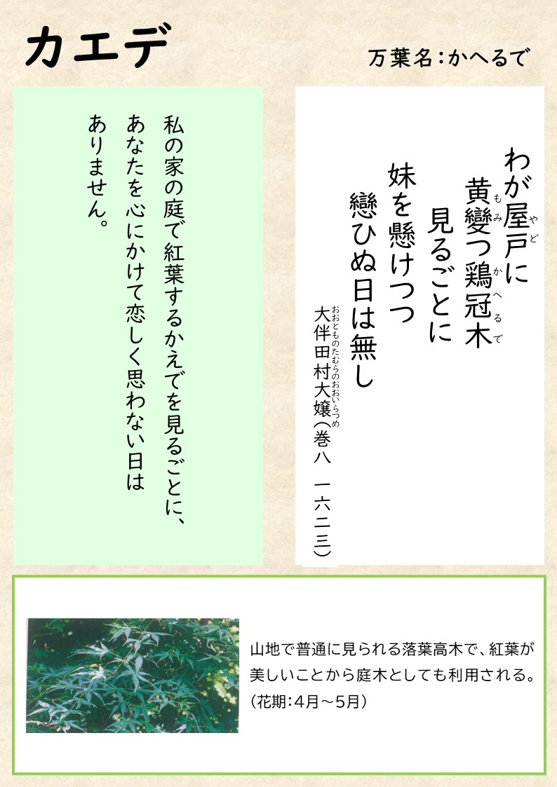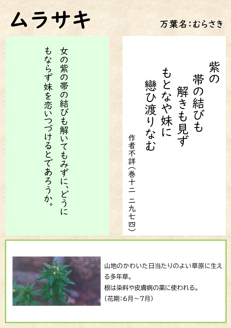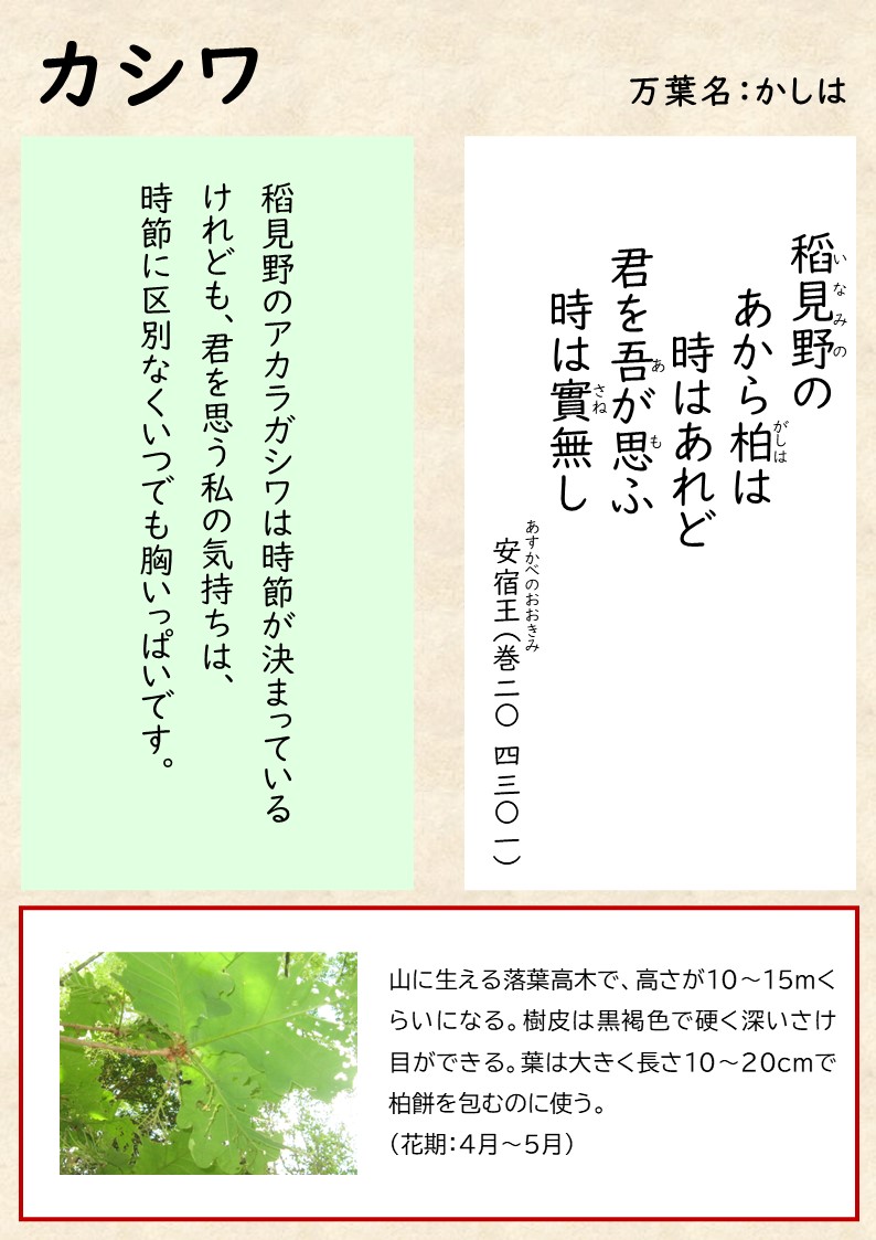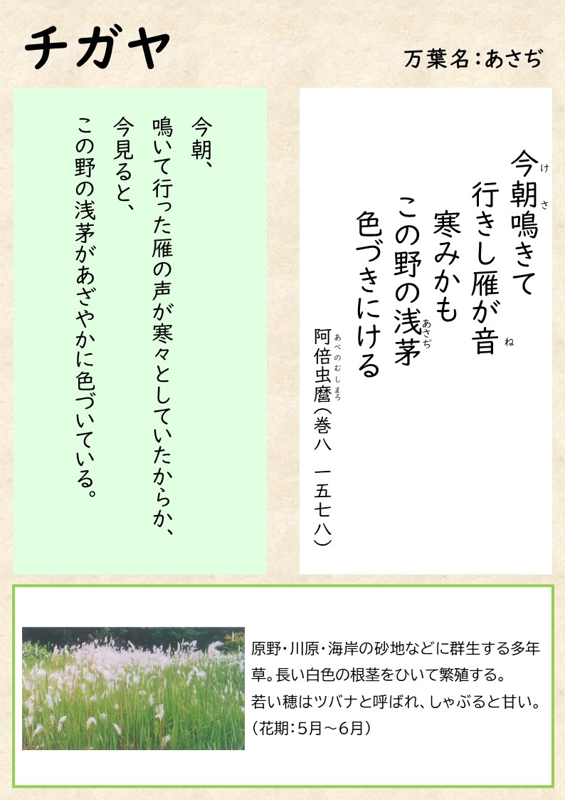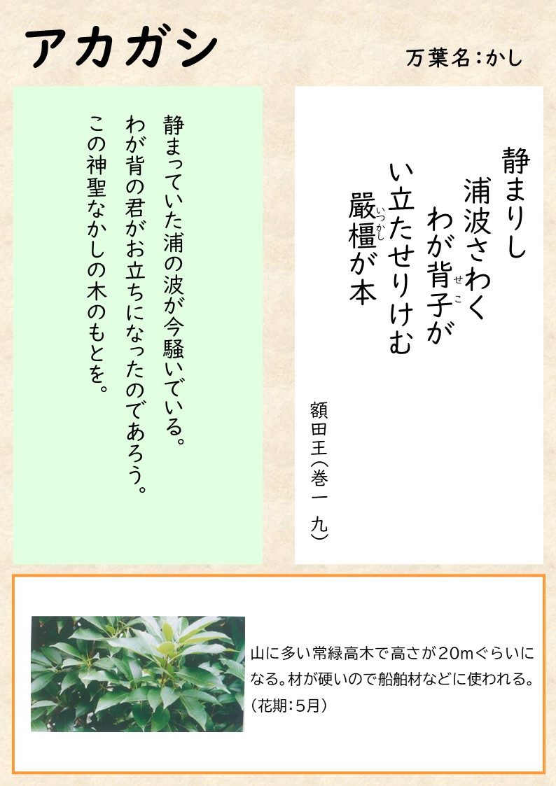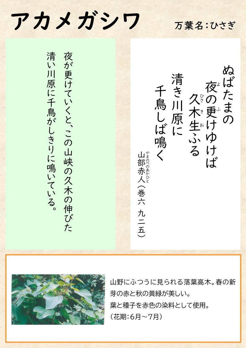 万葉植物園の植物の解説と、その植物が詠まれた歌を紹介します。歌の隣には、意味が分かるように訳を並べました。