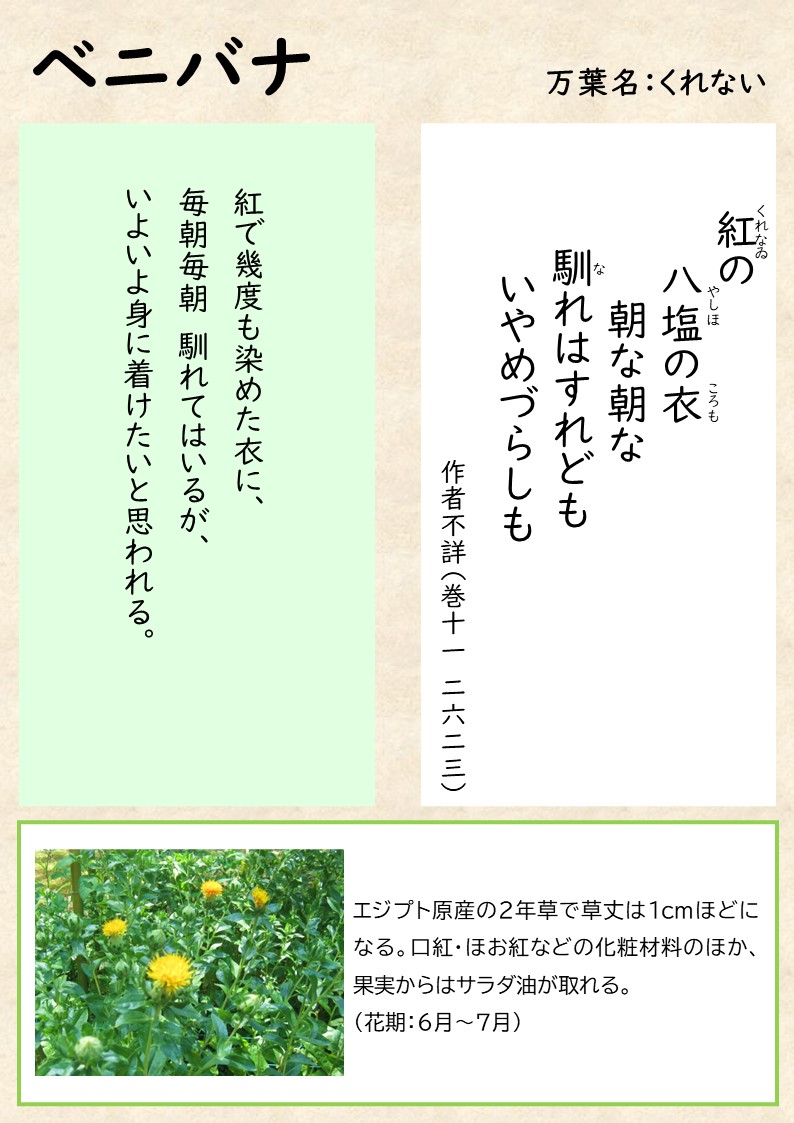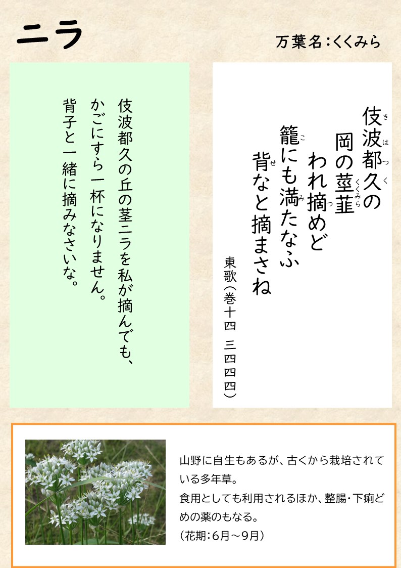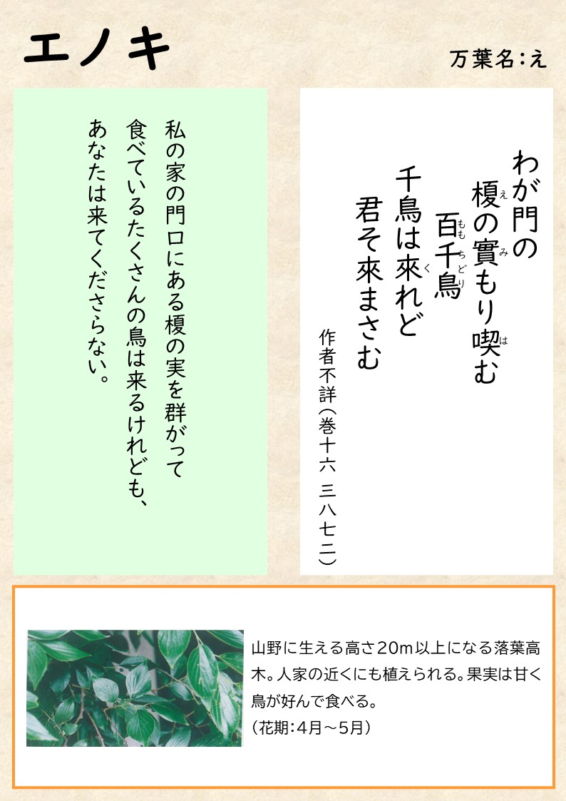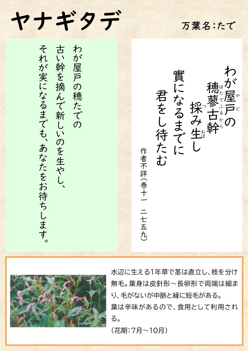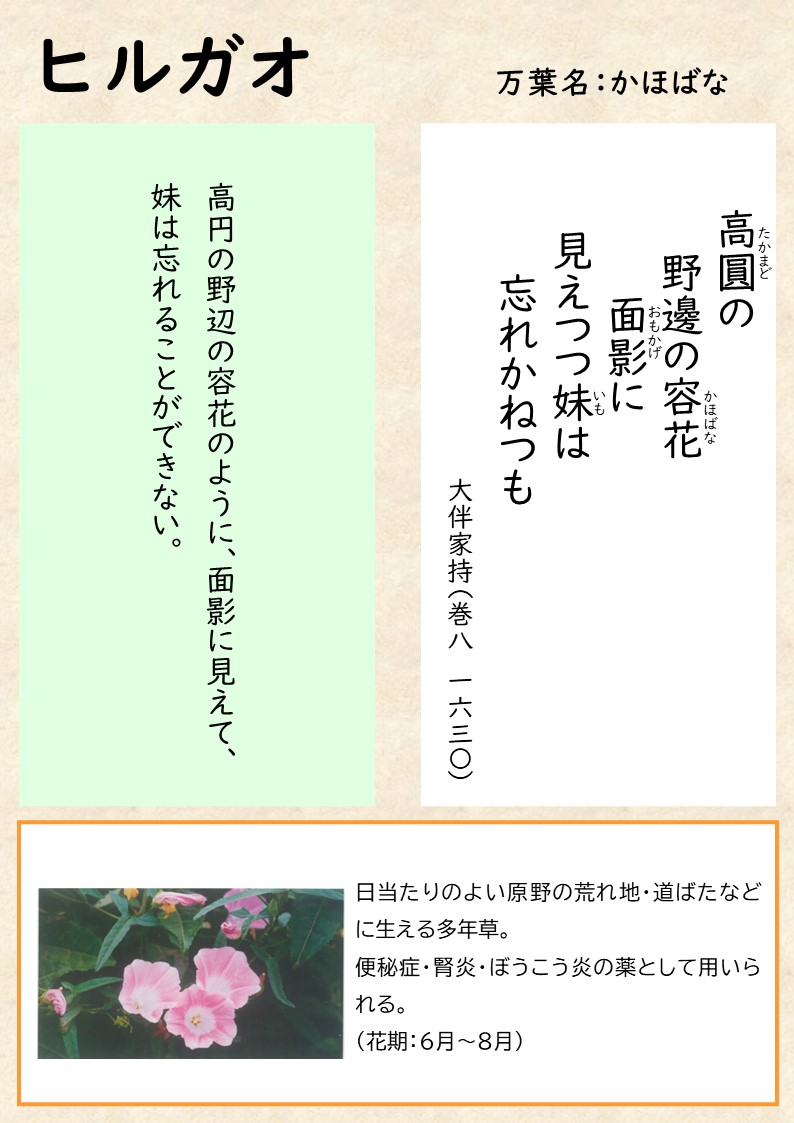 万葉植物園の植物の解説と、その植物が詠まれた歌を紹介します。歌の隣には、意味が分かるように訳を並べました。