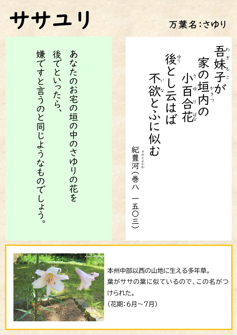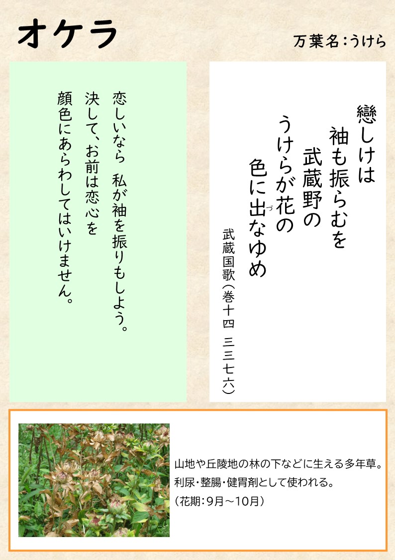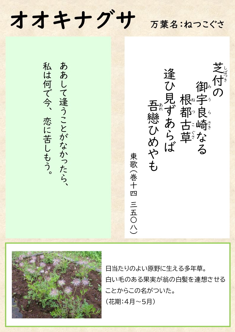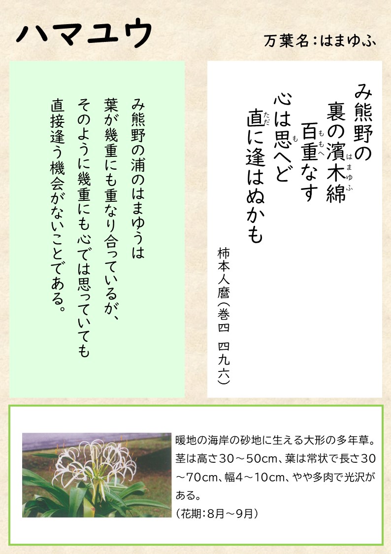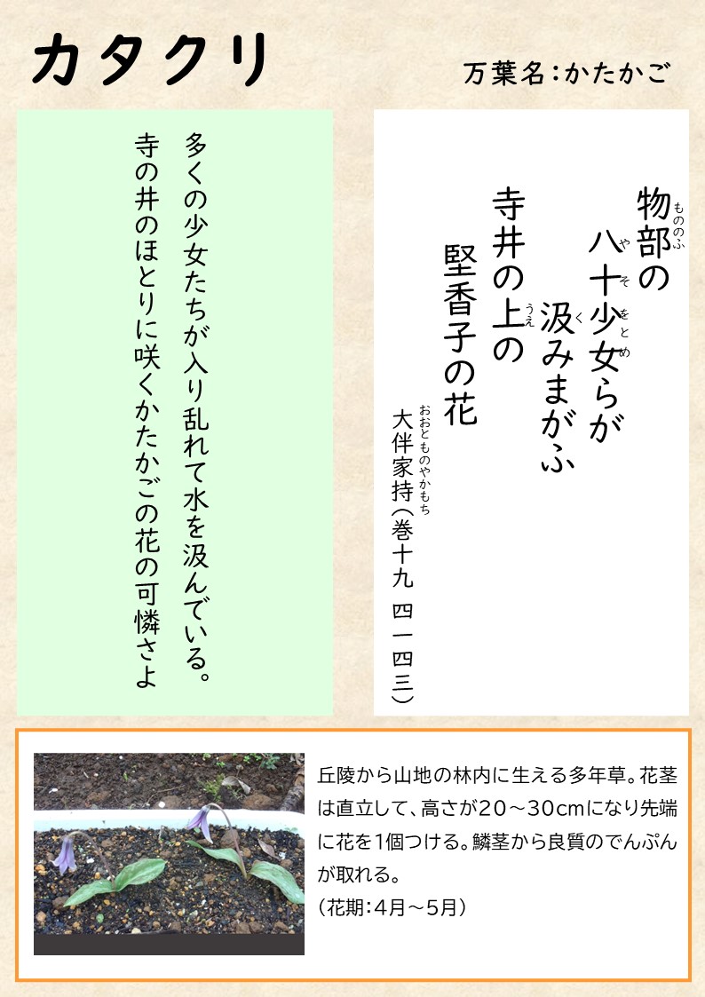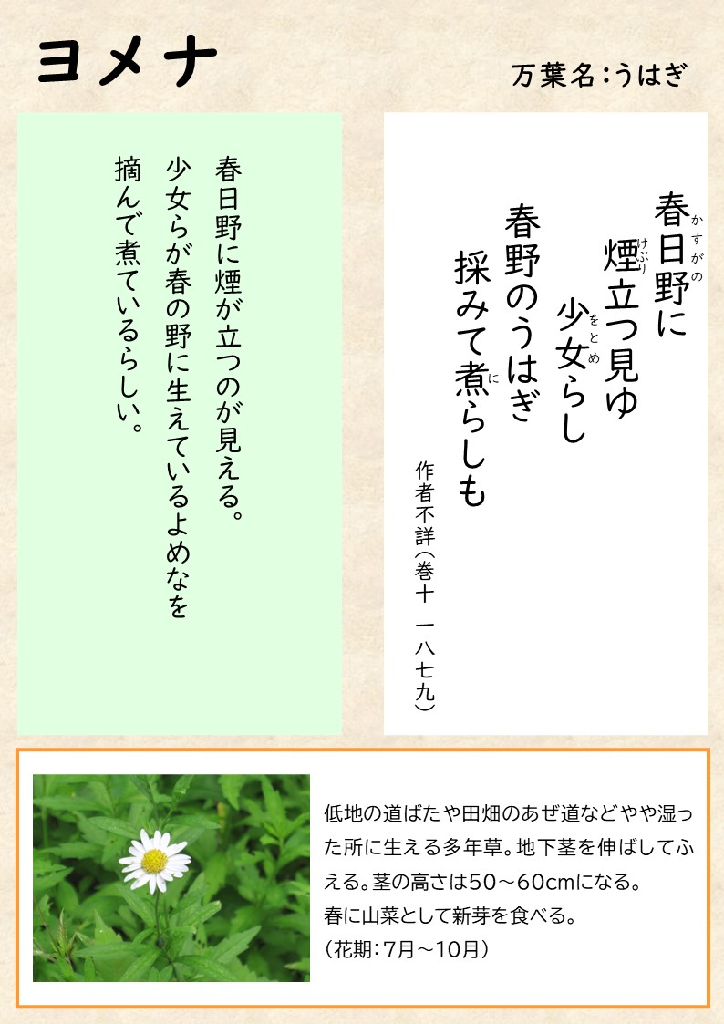 万葉植物園の植物の解説と、その植物が詠まれた歌を紹介します。歌の隣には、意味が分かるように訳を並べました。