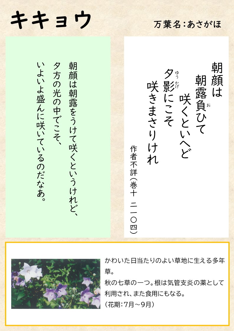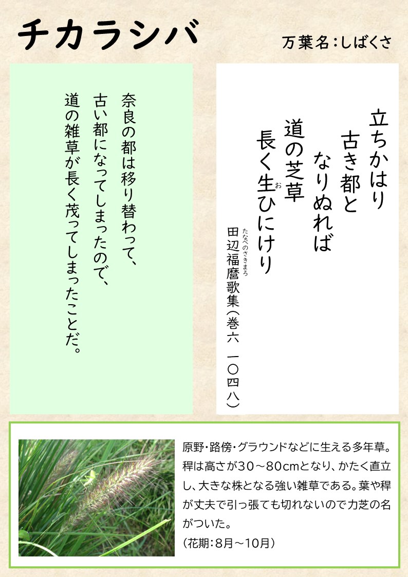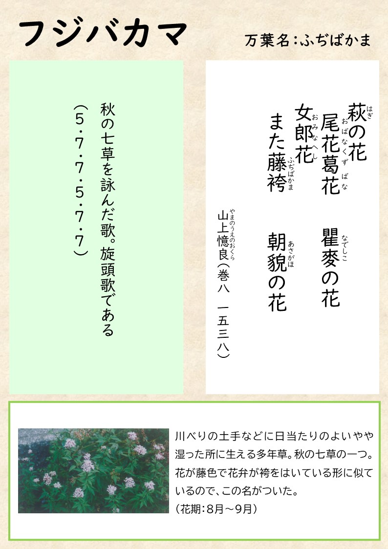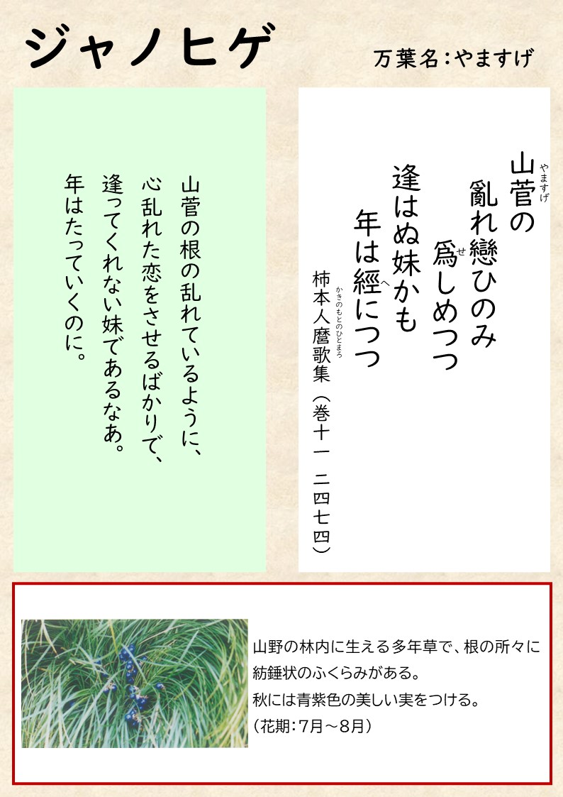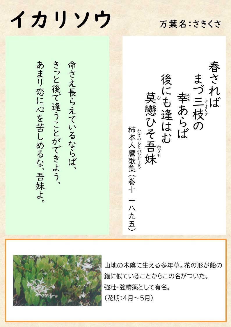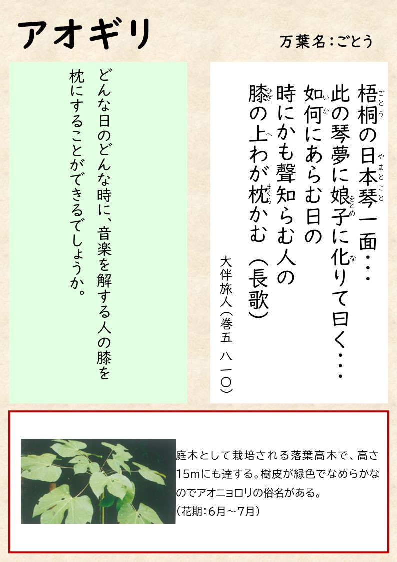 万葉植物園の植物の解説と、その植物が詠まれた歌を紹介します。歌の隣には、意味が分かるように訳を並べました。